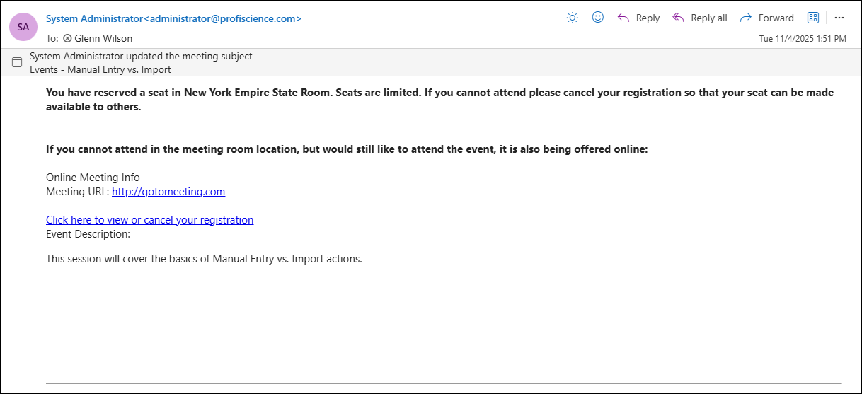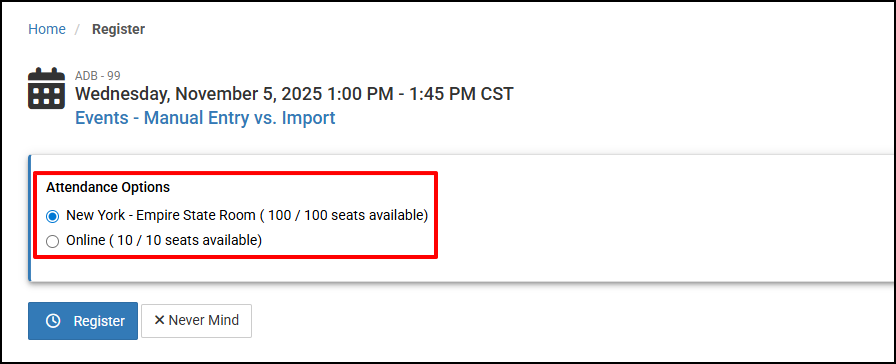 In some cases, you may need to choose which location in which you want to attend. Accept the default or make a different choice and select Register one more time.
