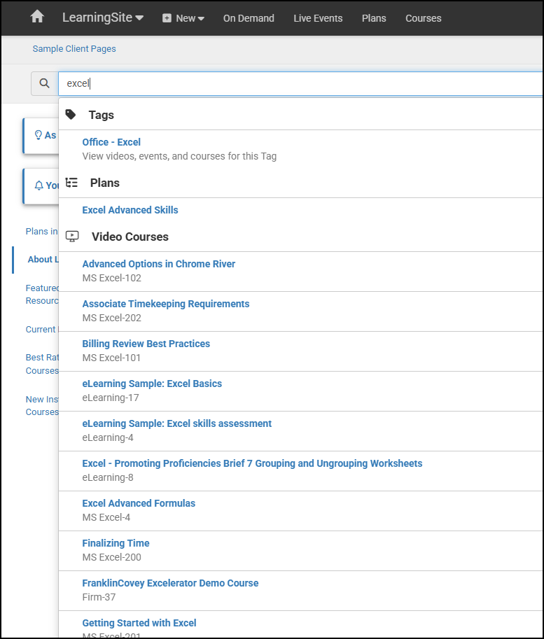 If you want to find everything in UniversitySite about "Excel" or "Security", or "Outlook" just type in the search box at the top of every page and pick an item. If you choose a Tag, it may show you a number of items all marked with that Tag. If you choose a Course or Plan or Event it will take you to that specific item.