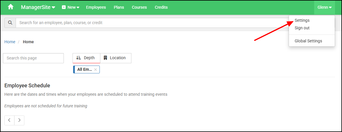- Once in ManagerSite, choose your name in the upper right and select Settings.