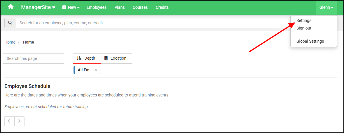 - Once in ManagerSite, choose your name in the upper right and select Settings.
