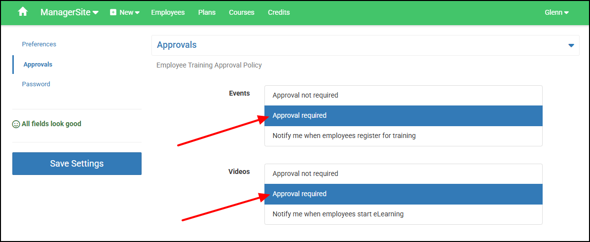 - From the Employee Training Approval Policy section at the top for Events and for Videos, choose Approval Required.