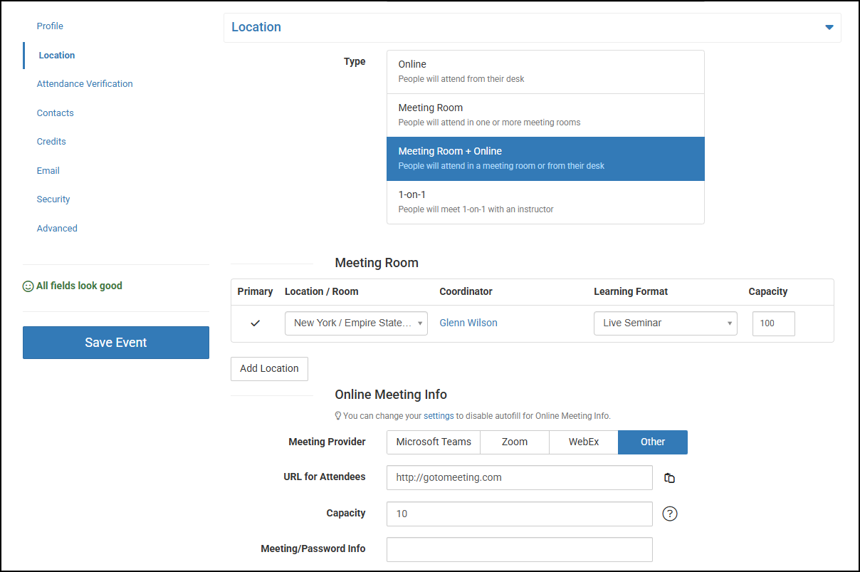 - Select Online as the Location Type and be prepared to enter the URL, capacity, dial-in info, and any meeting info details for use with the meeting software (Webex, Zoom, etc.).