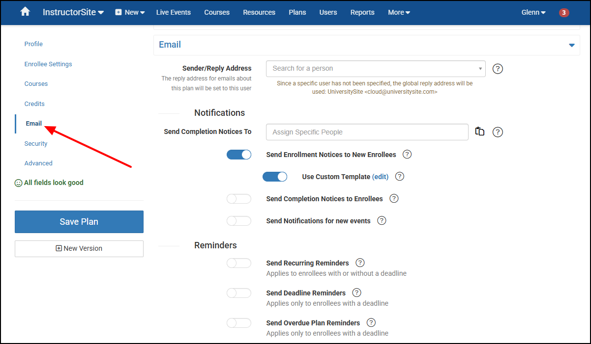 When you need to control whether emails are sent for Enrollment Notices, Reminders, Congratulations, or New Events, you want to Edit the Plan and turn them off as needed.