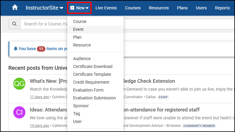 Use + New menu on the Main Navigation Bar to add Courses, Events, Plans, Resources, and more.