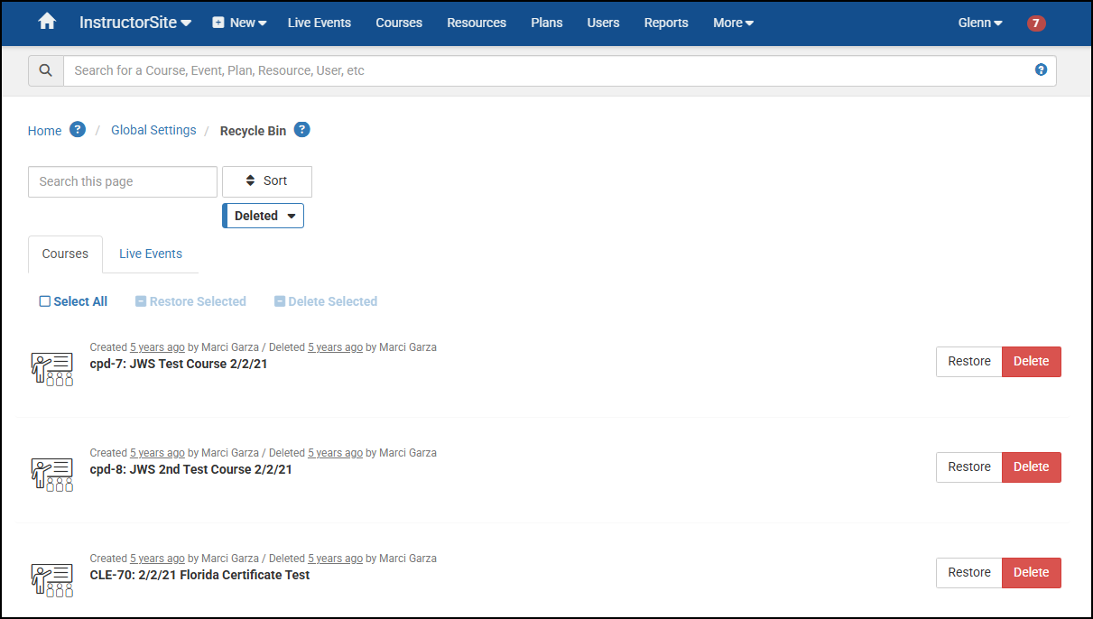The Recycle Bin contains deleted Courses and Events. These items can be restored or permanently deleted.