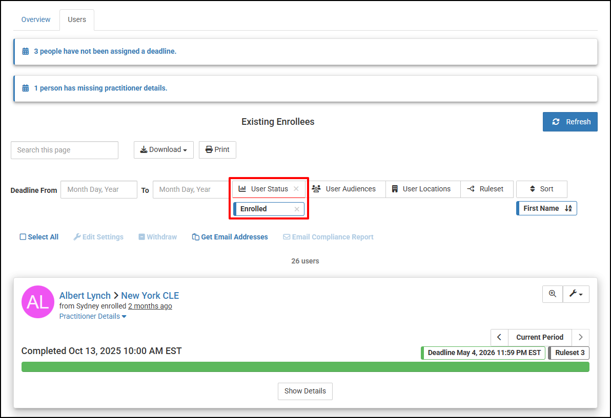 The Users tab for the Plan viewer lists the status of all Learners who are enrolled in this Plan and allows you to enroll others. This viewer can be filtered by: