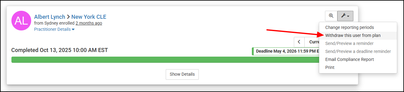 If you need to withdraw or remove a Learner from this Plan, select the Wrench dropdown for their record and select Withdraw this user from plan.