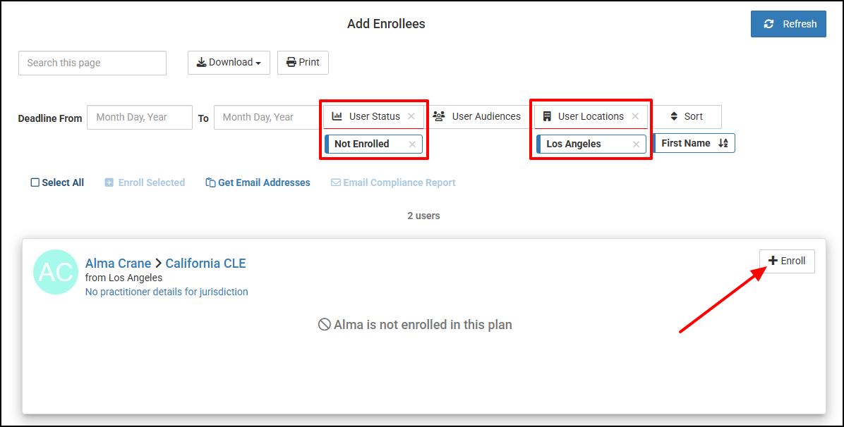 The example below shows how to enroll using the Not Enrolled filter and the location "Los Angeles" as the criteria. To specify criteria to be used to automatically enroll Learners, go and Edit the Plan.