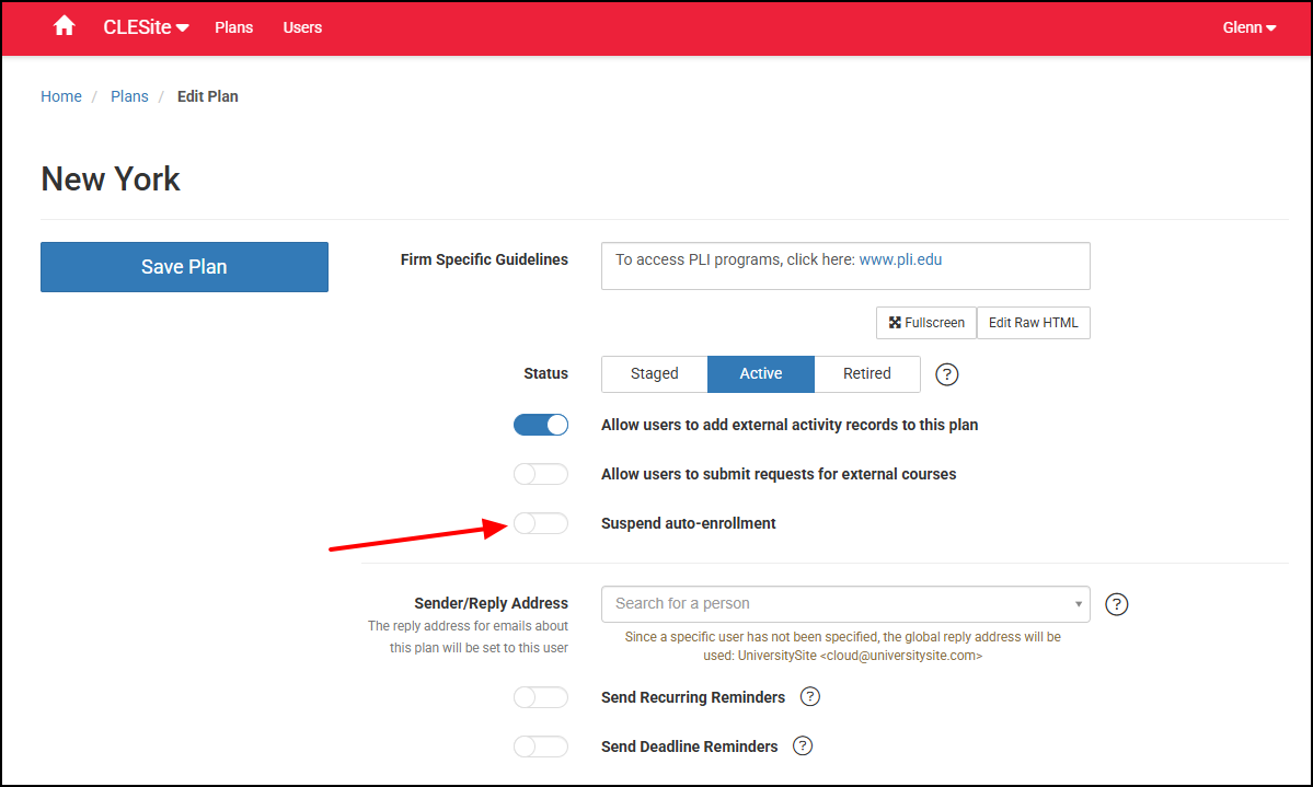The switch is located directly below the auto-enrollment section in the Plan Editor.