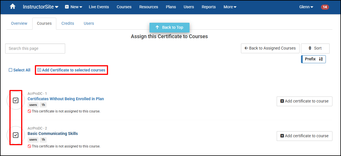 You can assign a Certificate to multiple Courses at once. Simply find the Certificate from the More dropdown in the Main Navigation Bar in InstructorSite and select the + Assign this certificate to courses button.