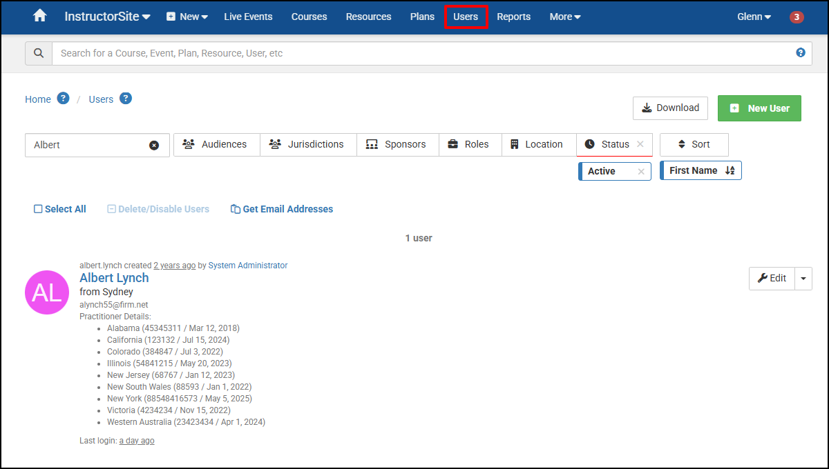 - In InstructorSite, select Users from the Main Navigation Bar.