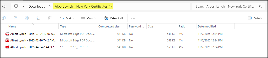 - The Certificates will download to a zip file. Open the zip file to access the Certificates.