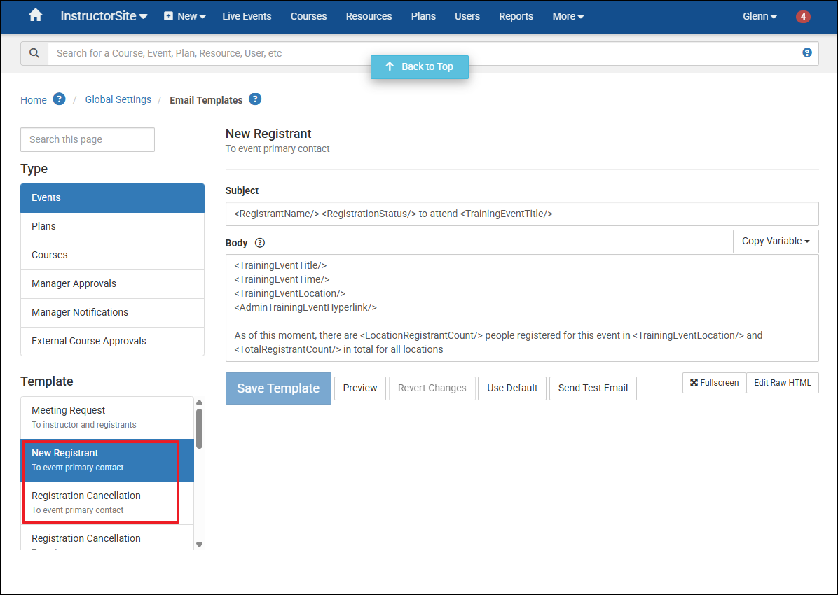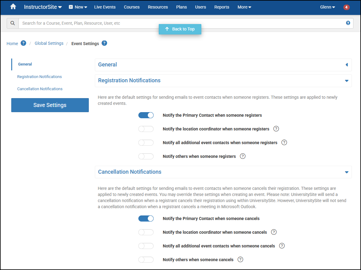 You can turn notifications for Event Registration and cancellation On or Off globally and at the Event Level, but they must be ENABLED at the Global Level in order to use them on Events and there will be a warning if you try to enable them at the Event Level but they are Off globally.