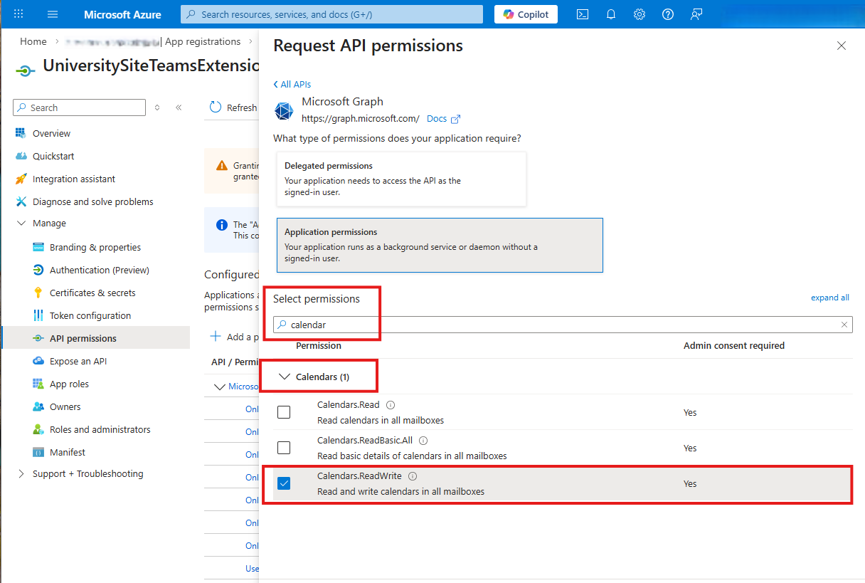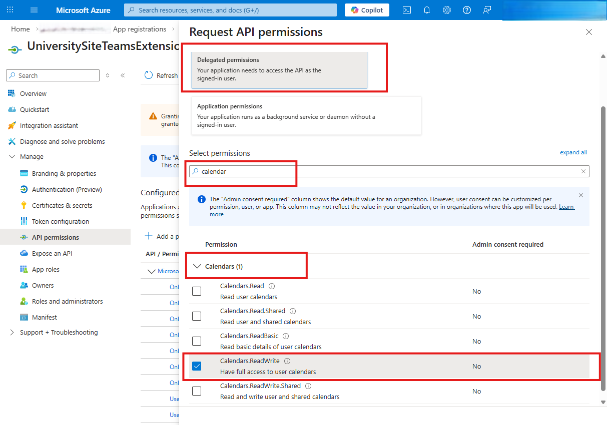 At the top, select Delegate permissions then go to the select permissions search field and re-type calendar. Click Calendar |Expand and select the Calendars.ReadWrite permission.