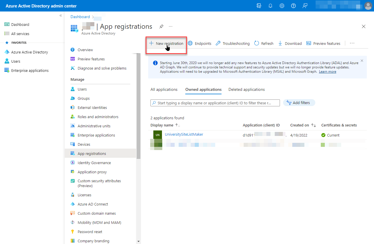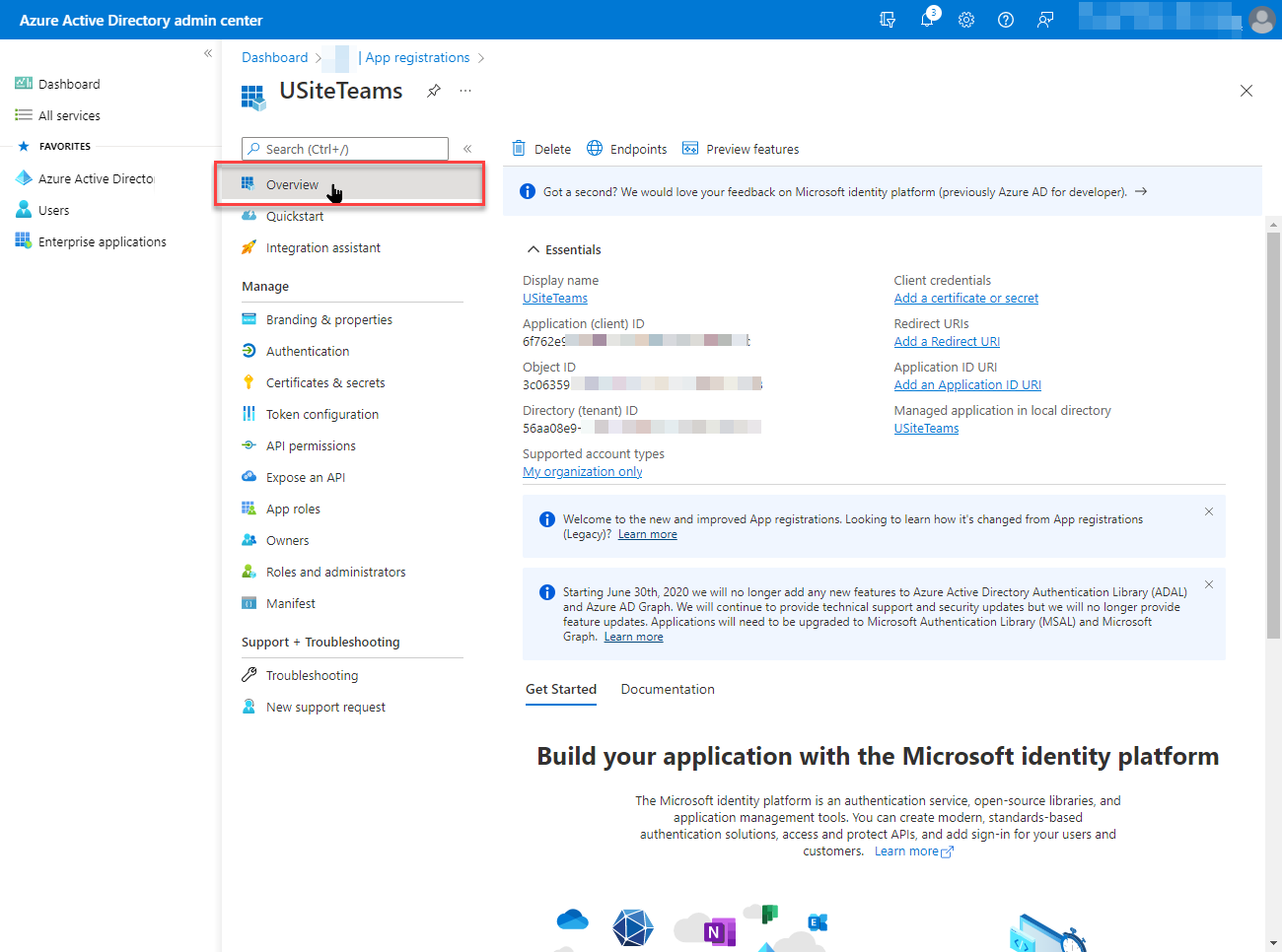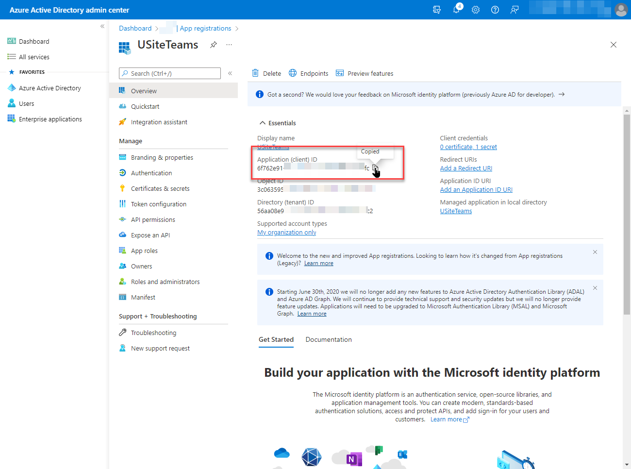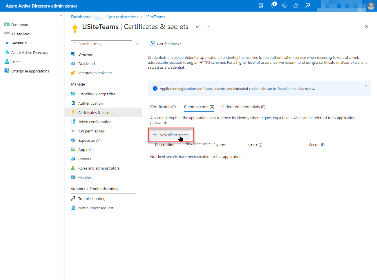 Step 1 - Azure Admin: Register the UniversitySite Teams Extension application with this Microsoft Identity Platform to create the Application (client) ID, Directory (tenant ID), and Client Credential Secret Value. Provide this information to the LMS Admin.
