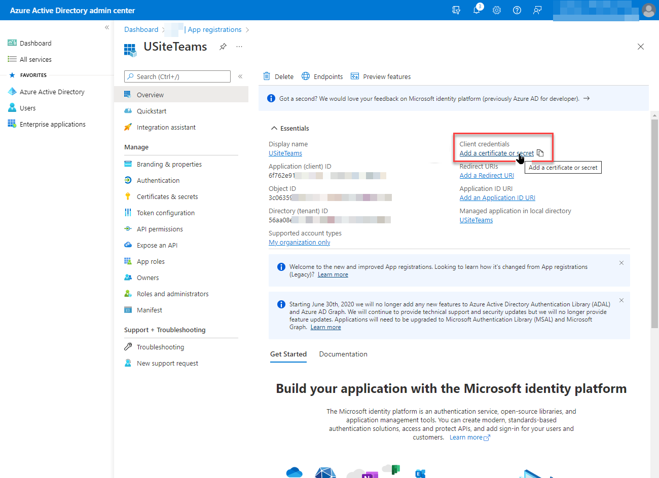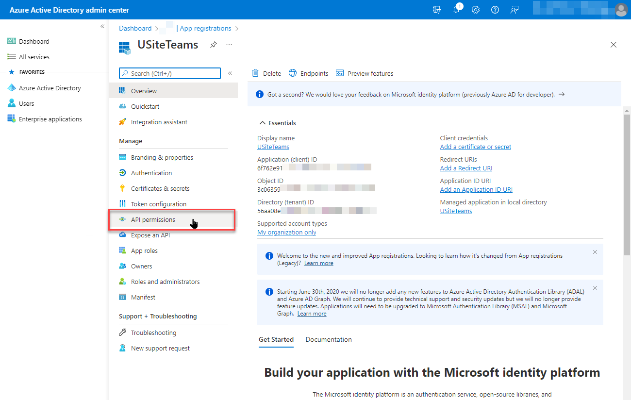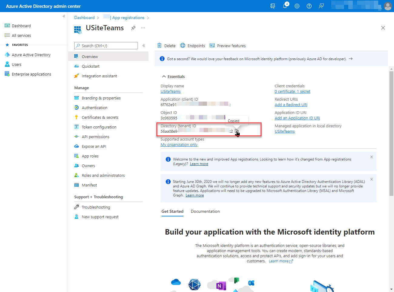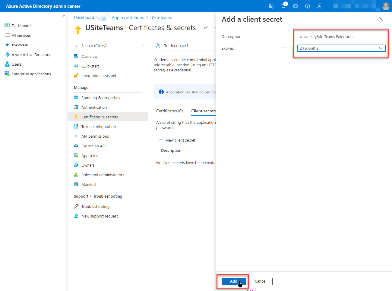 Step 1 - Azure Admin: Register the UniversitySite Teams Extension application with this Microsoft Identity Platform to create the Application (client) ID, Directory (tenant ID), and Client Credential Secret Value. Provide this information to the LMS Admin.