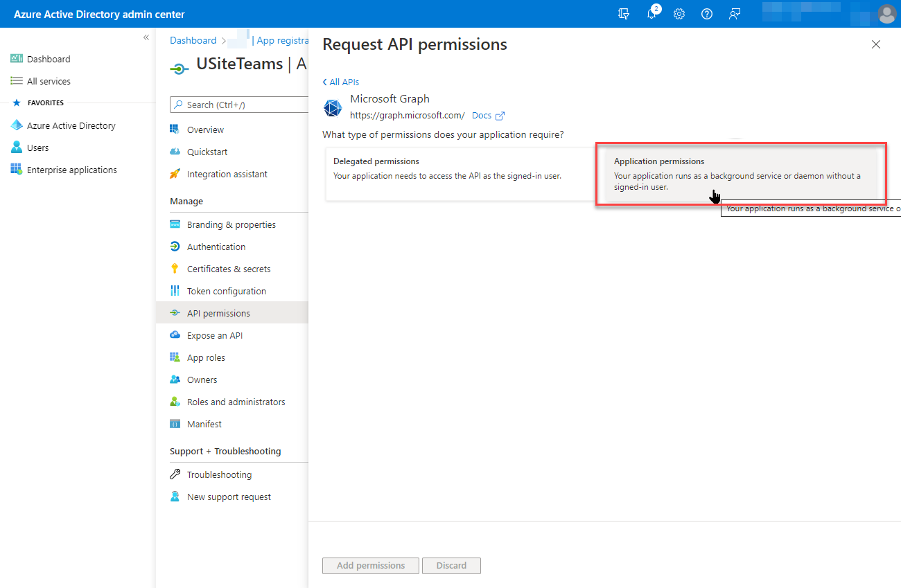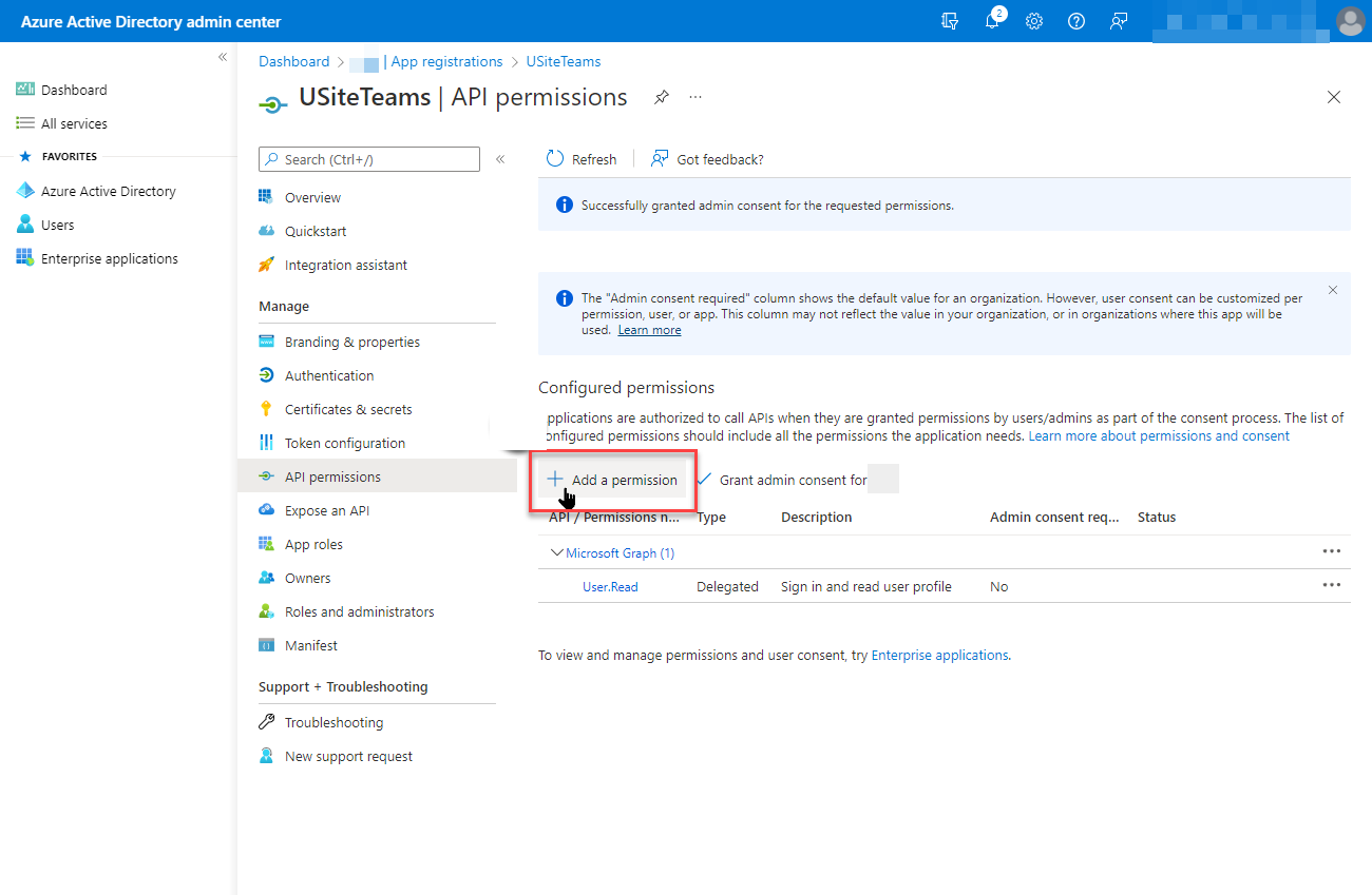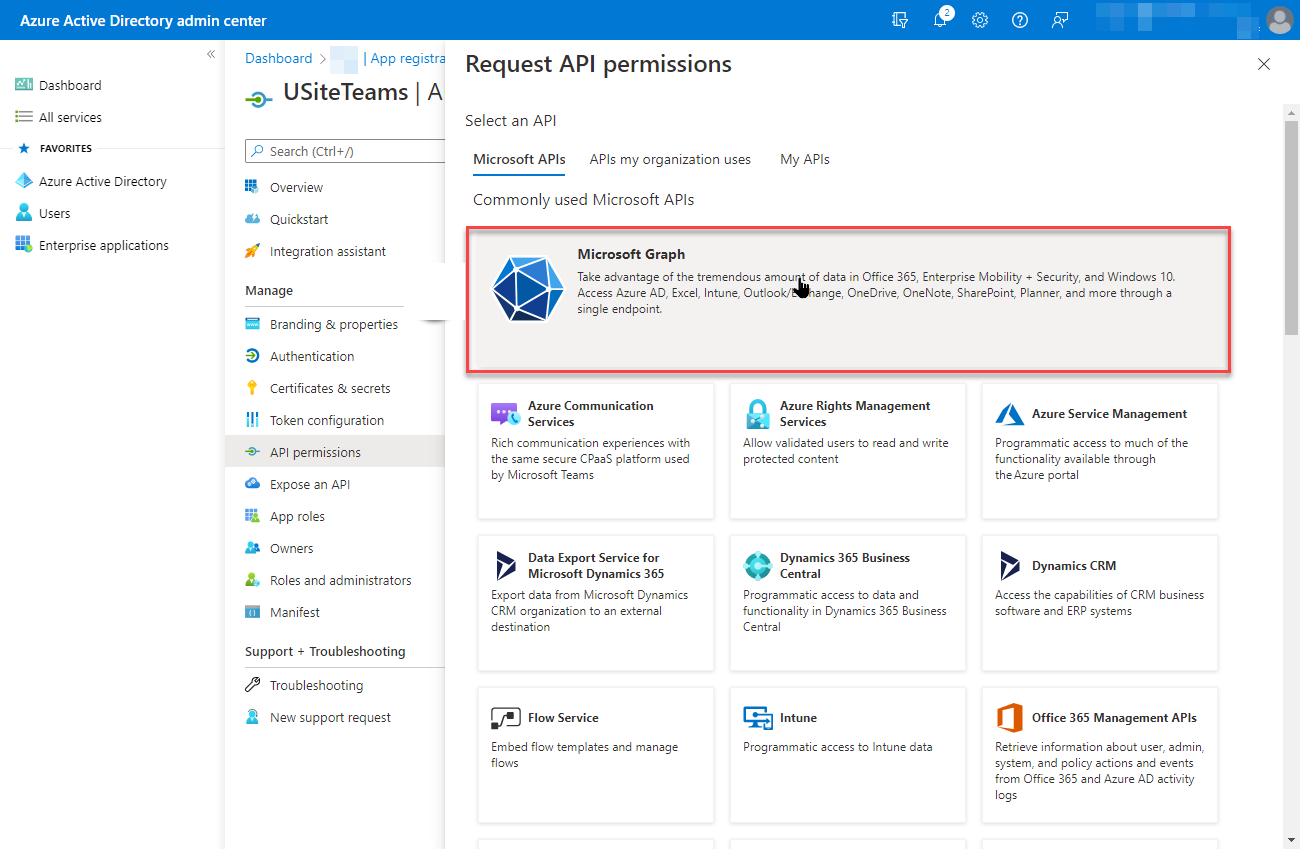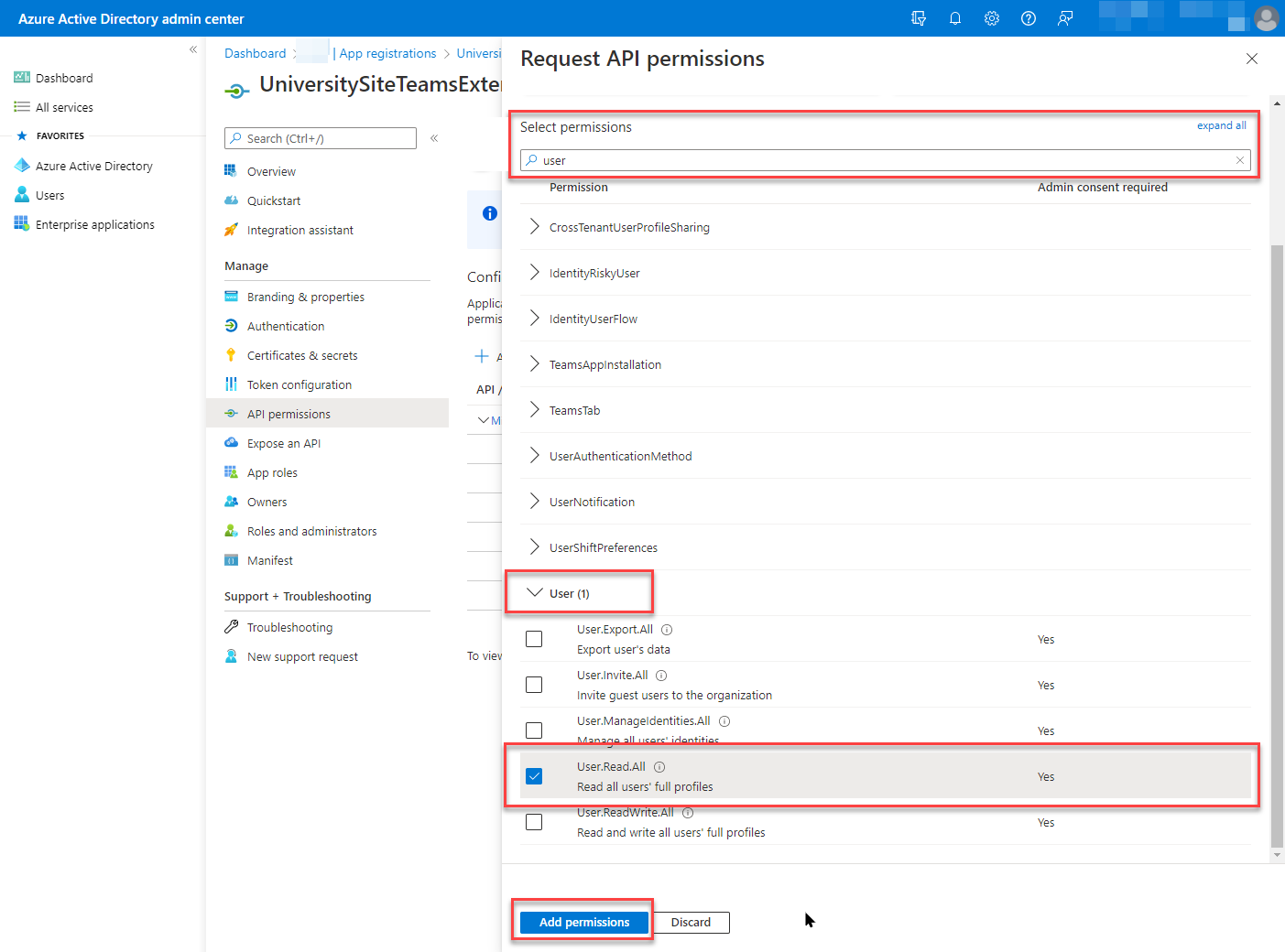 Again, from the Select permission field, search for user. Click User | Expand and select the User.Read.All permission, and then click Add permissions.