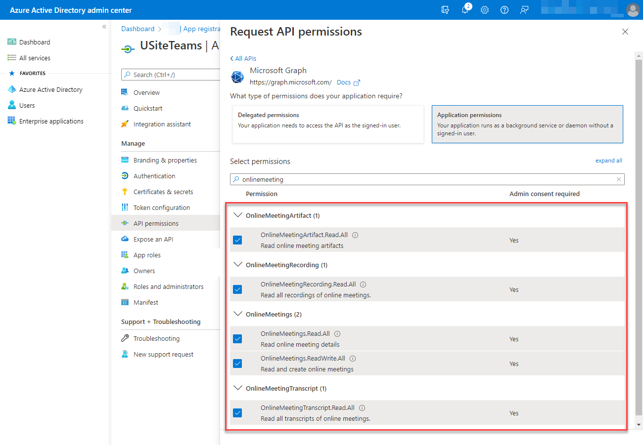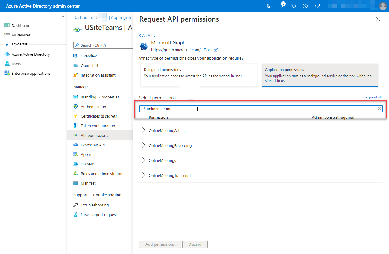 From the Select permissions search field, type onlinemeeting to show a list of the related permissions.