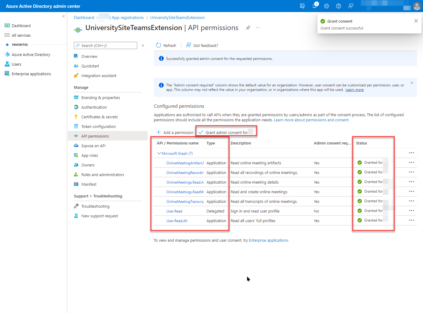 Click Grant admin consent for newly added permissions, then click Yes to confirm.