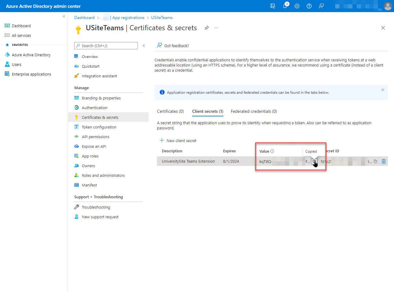 2. Provide the LMS Admin with the Application (client) ID, Directory (tenant ID), and the Client Credential Secret Value so they can add the values to UniversitySite.