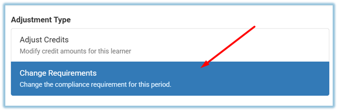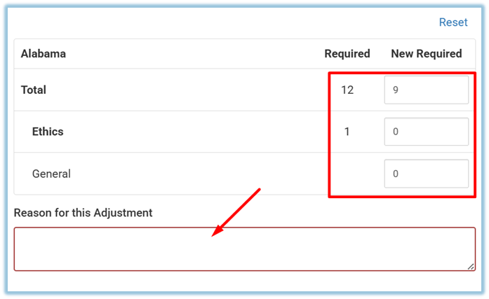 - In the New Required column, enter in the adjusted values for the period’s credit requirements, fill out the Reason for this Adjustment field, then click Submit.