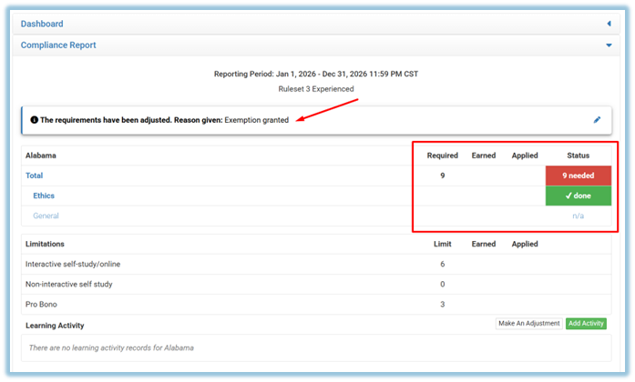 - The CLE Plan will now show the values from the New Required field, and the Plan will show the reason for the exemption at the top.