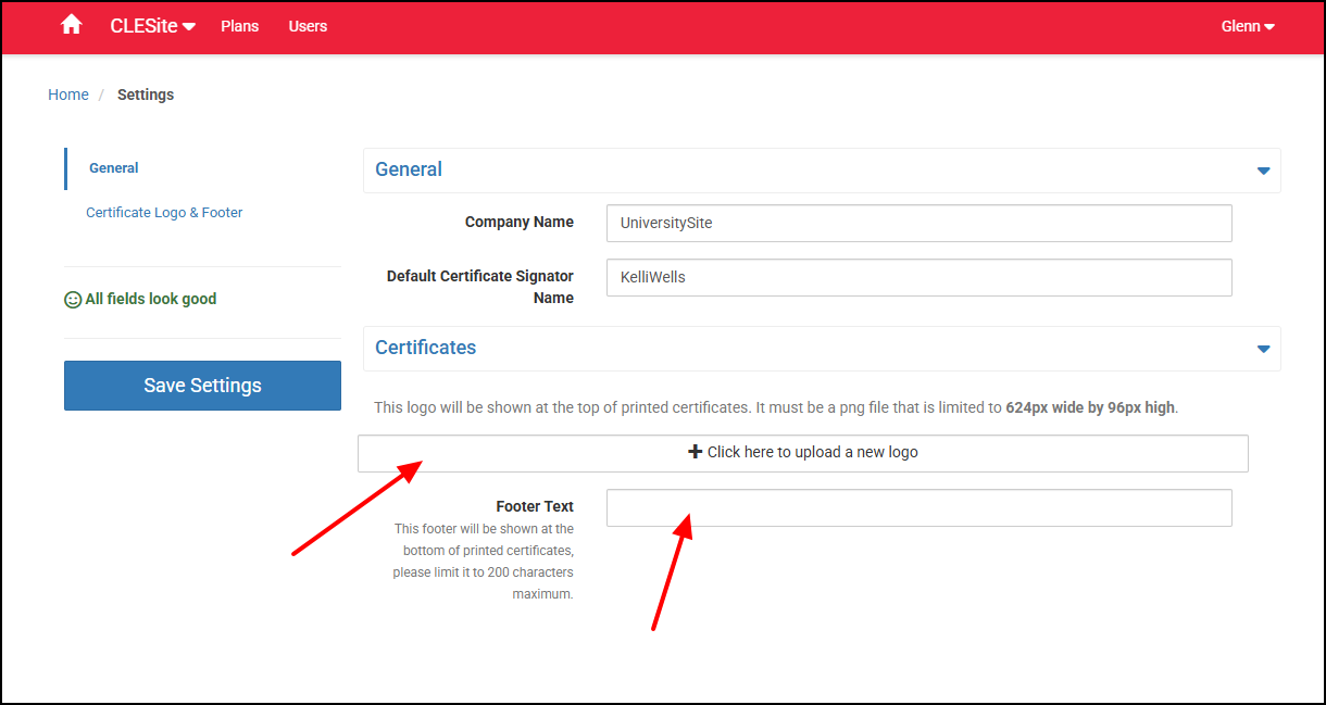 - In the Certificates section, select + Click here to upload a new logo to upload a Logo if desired.