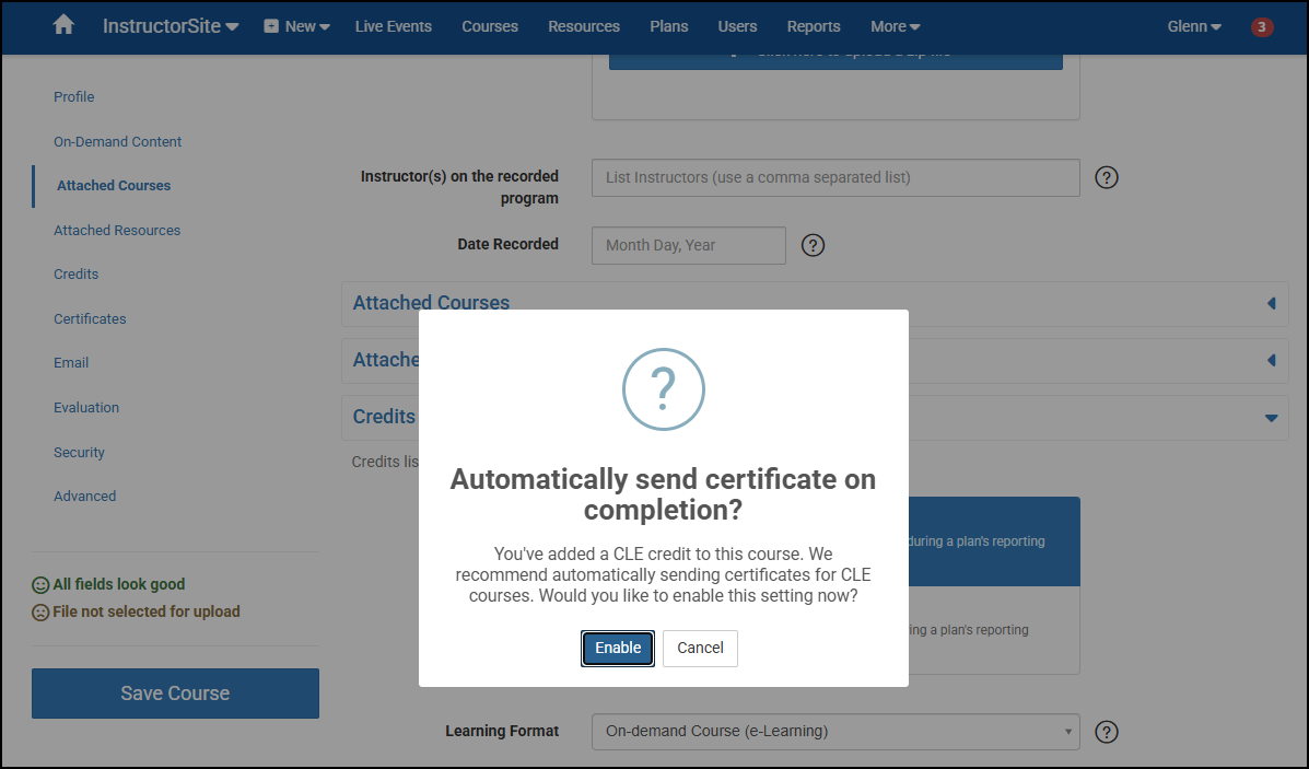 When creating an On-Demand Course, the below prompt appears to enable automatically sending Certificates upon completion of the Course. This is because On-Demand Courses can be completed by Learners at any time.