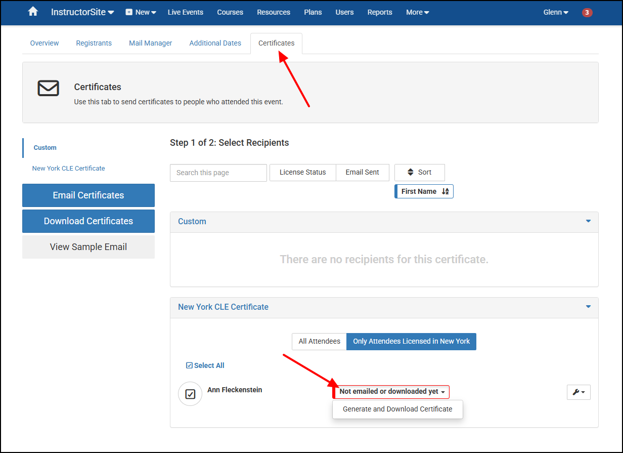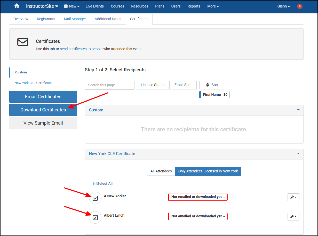 - Select their Not emailed or downloaded yet box, then select Generate and Download Certificate.
